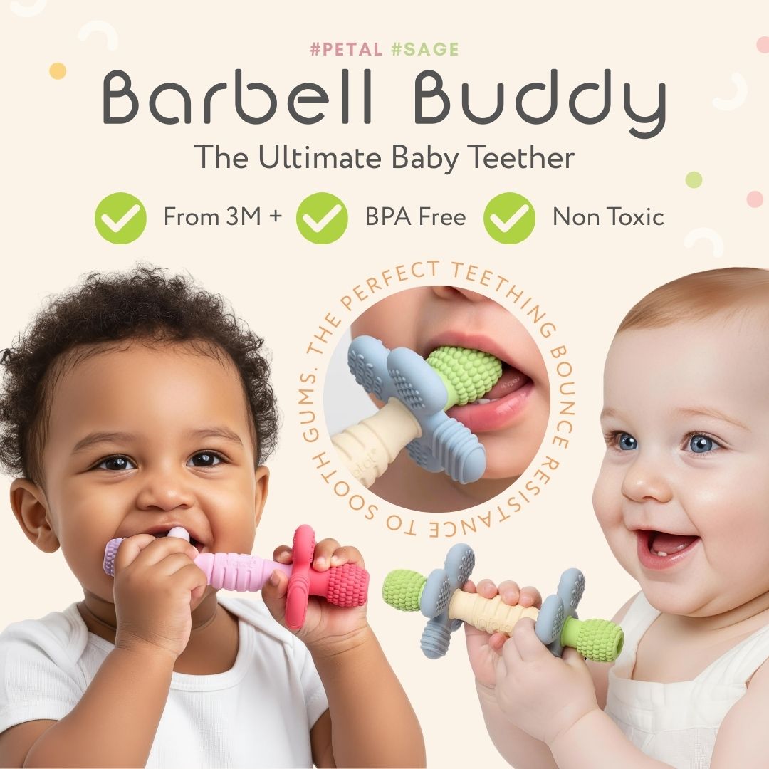 A soothing moment for your little one. The Barbell Buddy is made from soft food grade silicone that gently calms sore gums and supports every stage of teething with safe comforting relief.