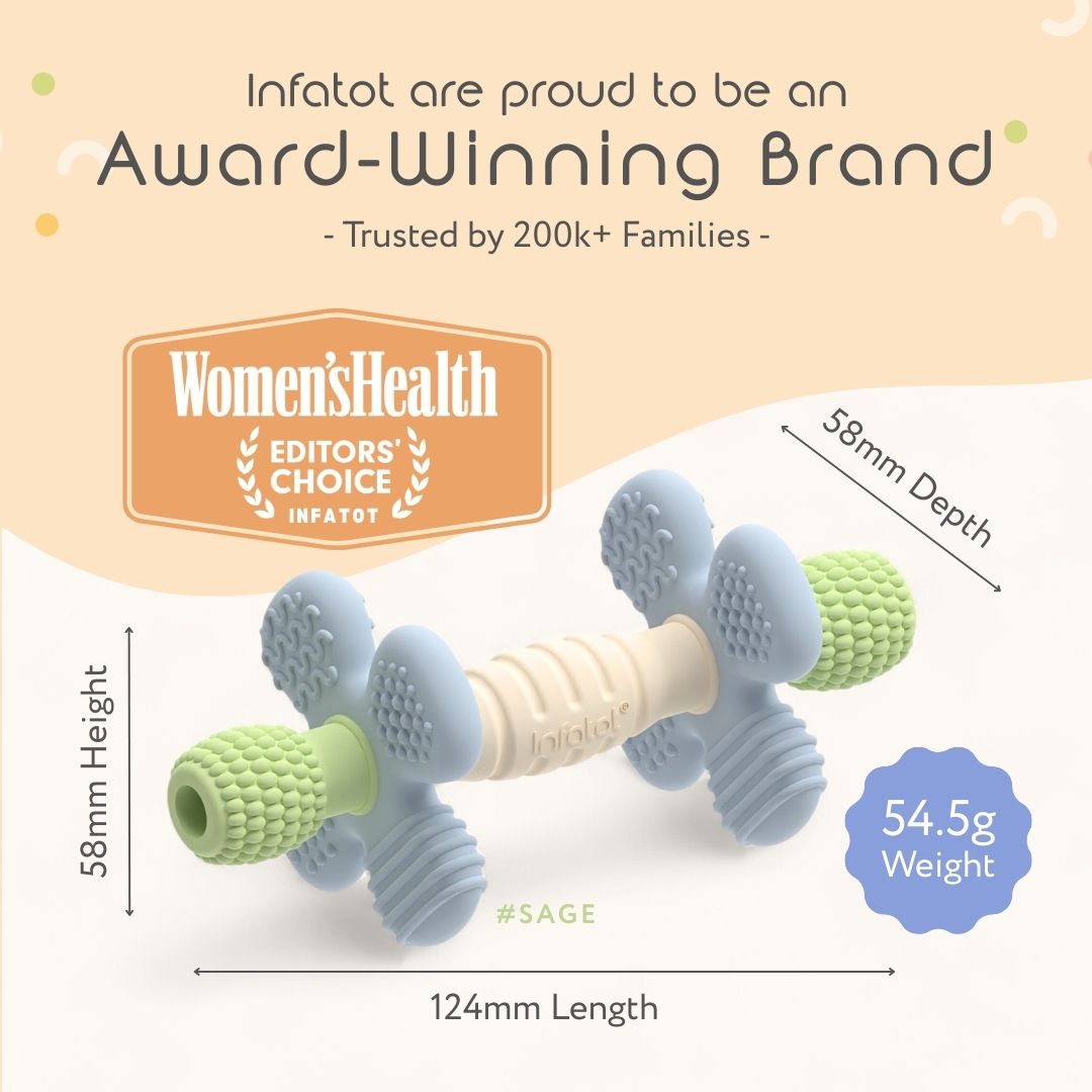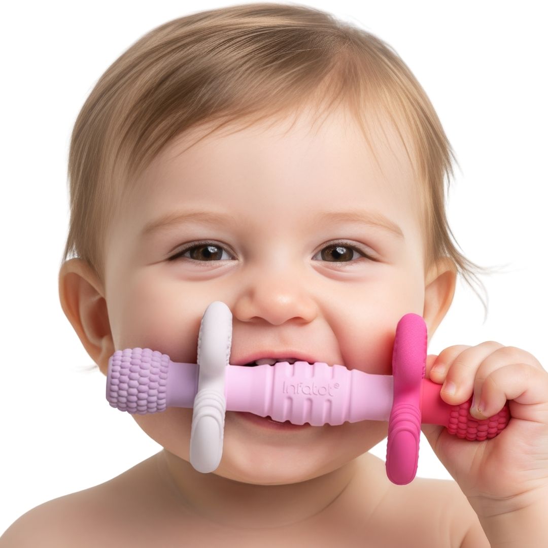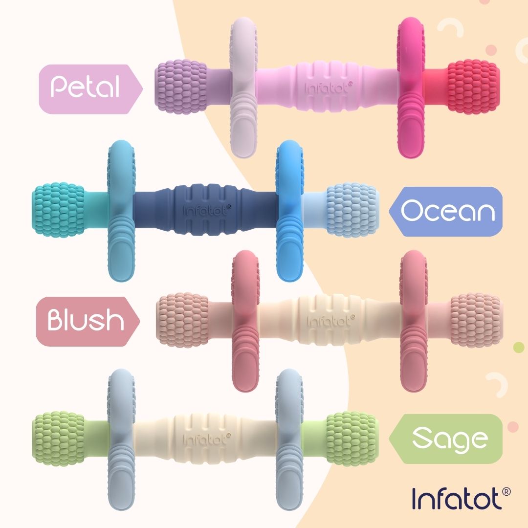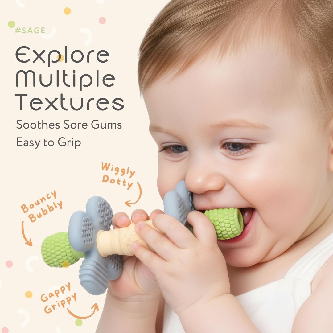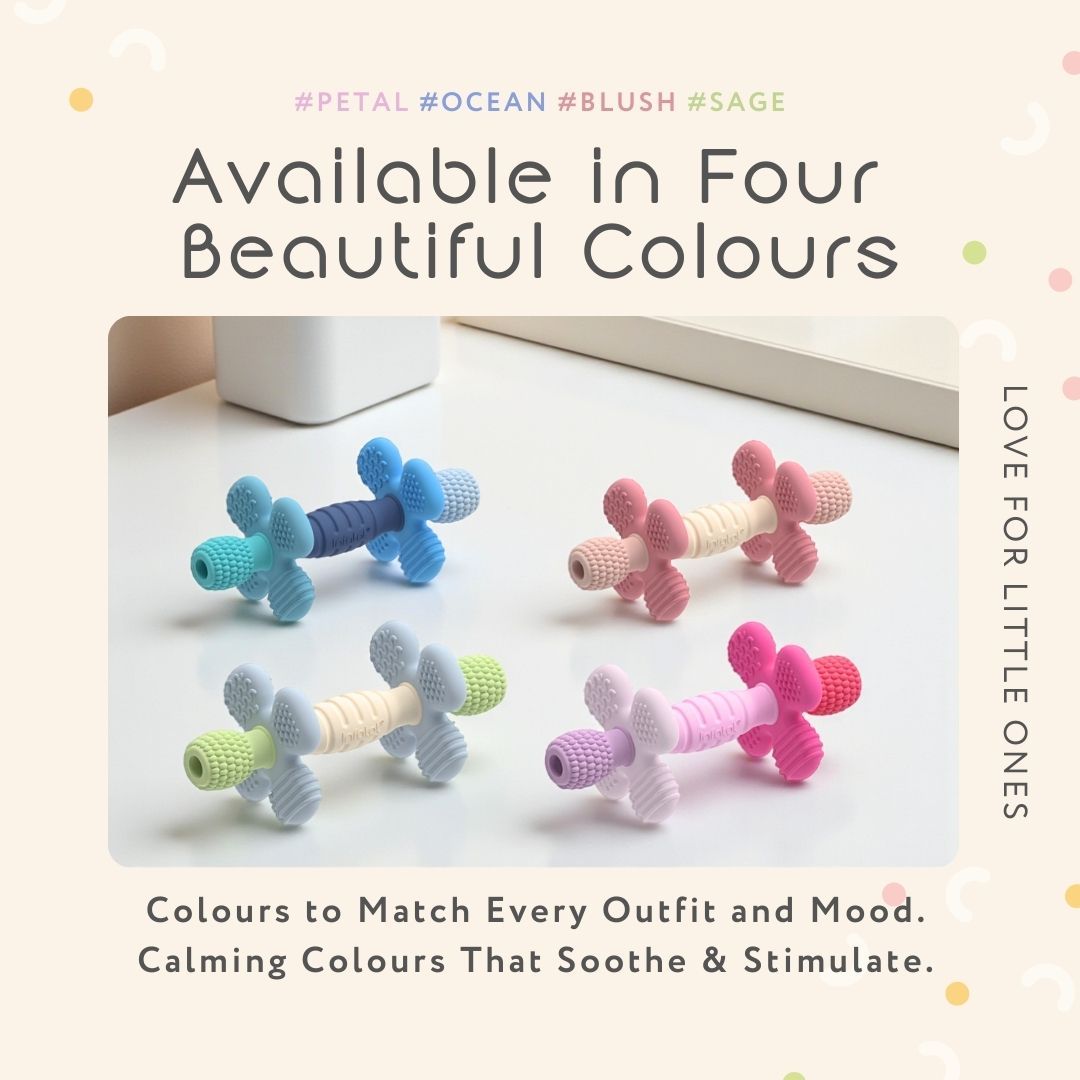 Shaped for tiny hands, the balanced barbell design is easy to grip from any angle and encourages independent play and early motor development. The smooth rounded ends and subtle textures provide a comforting mix of sensations that keep your baby engaged while easing gum pressure.