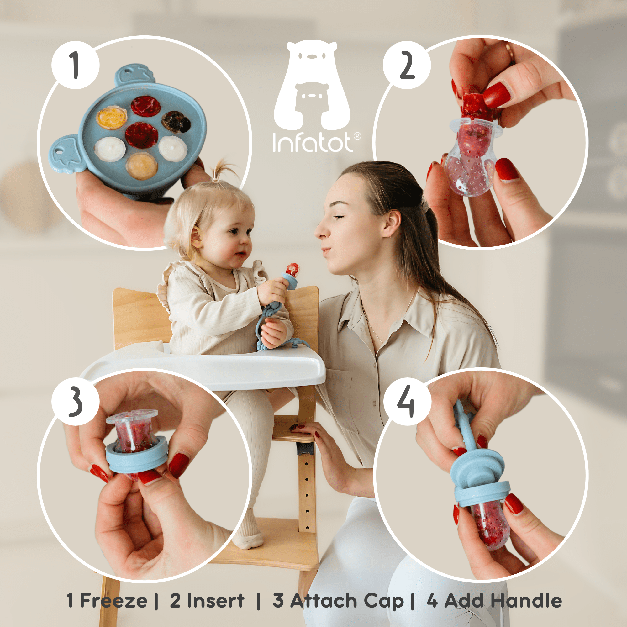 A gentle introduction to new tastes. The Infatot® Fruit Feeder & Baby Food Freezer Tray set is thoughtfully designed to support your baby’s journey into solid foods. Crafted with care, the ergonomic feeder allows babies to explore fresh fruits and vegetables safely, while the freezer tray lets you prepare and store homemade purees with ease.