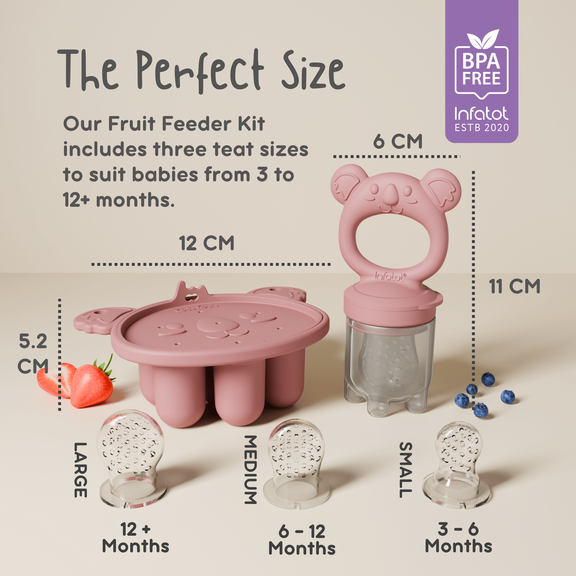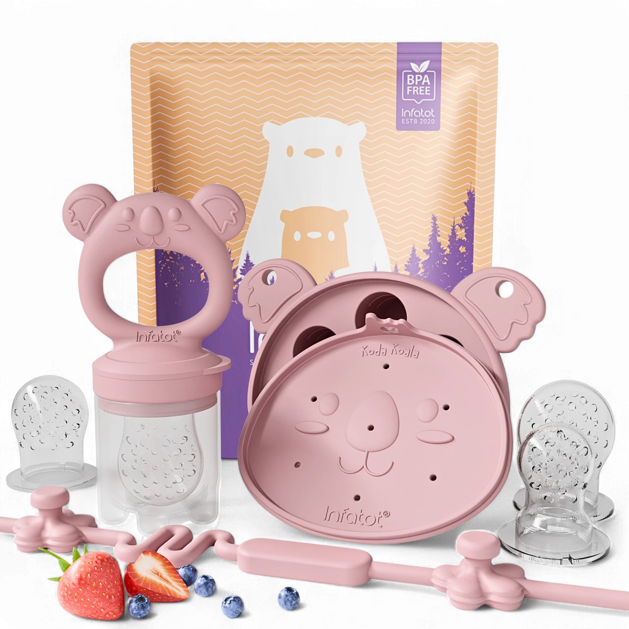 The Infatot Fruit Feeder & Baby Food Freezer Tray is a must-have for parents! The quality is fantastic—the silicone teats are soft yet durable, making them perfect for soothing sore gums. I love that it comes with different teat sizes, growing with my baby. The freezer tray is a game-changer for prepping nutritious frozen treats, and the Koda Koala baby teether is adorable and easy for little hands to hold.It’s super easy to clean, and the secure design ensures no choking hazards. My baby is obsessed with trying different fruits in the feeder, and it keeps them entertained while getting essential nutrients. Plus, the included toy clip means no more dropping it on the floor!The Plum color is gorgeous, and the entire set feels thoughtfully designed. If you’re starting solids or dealing with teething, this set is a lifesaver. Highly recommend