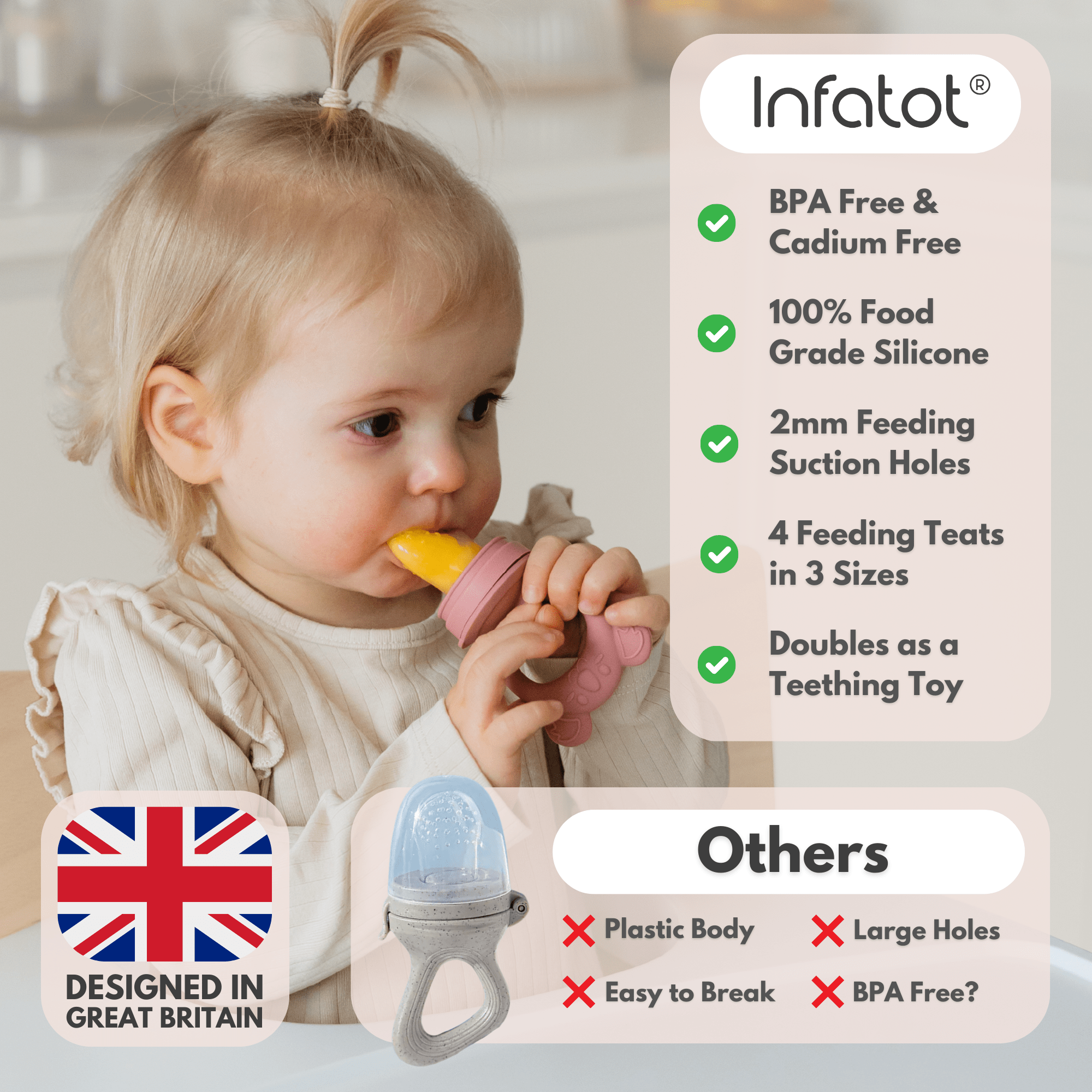 I absolutely love infatot products, I would highly recommend. They are super high quality and my baby loves them. My baby was suffering with teething and being able to make him frozen pops with this really helps him. The different size teets are great to grow as he grows and it’s all easy to wash. The attachment has also got so many uses to keep other toys and teethers attached to the pram and not on the floor.